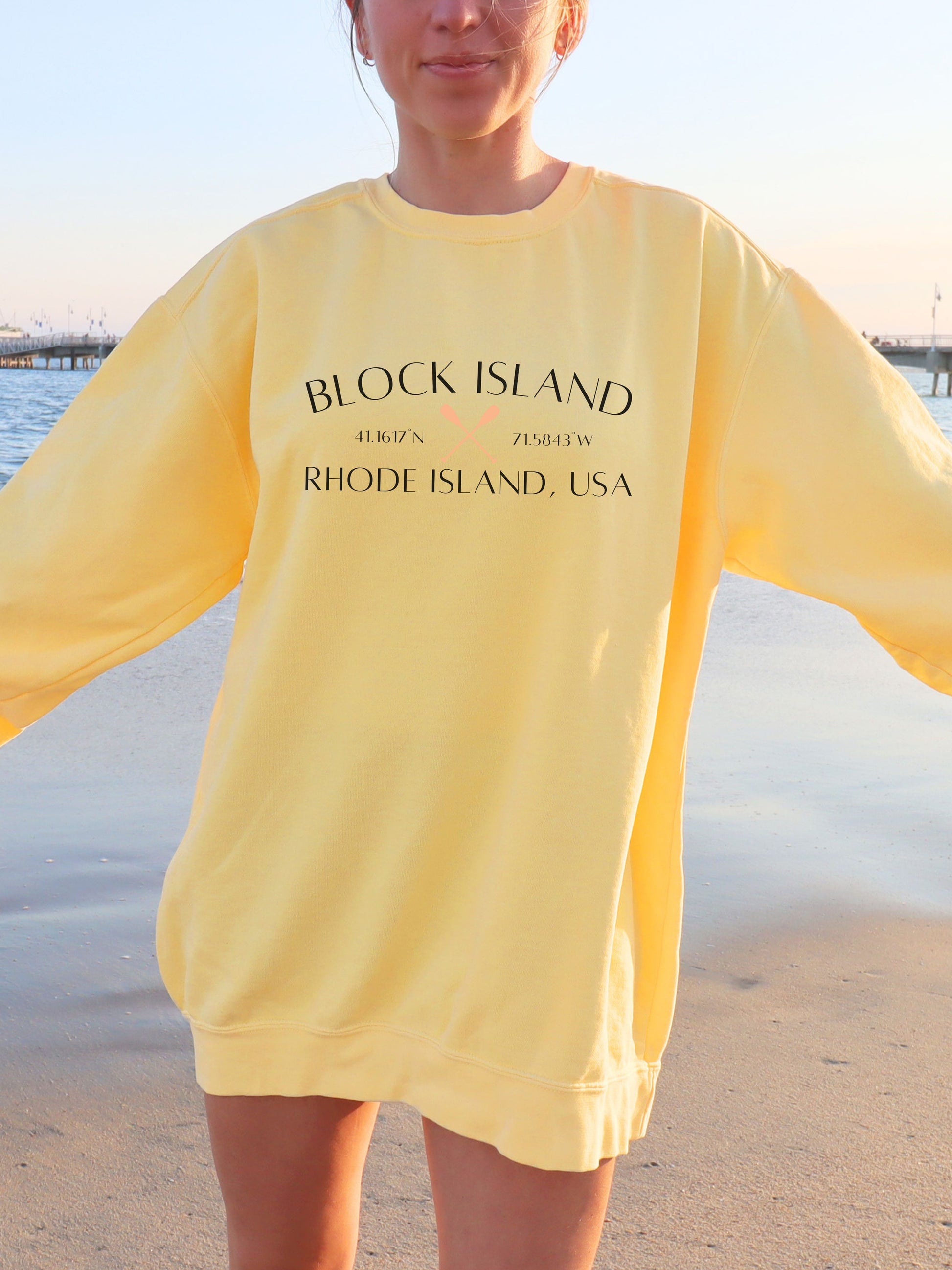 Block Island Rhode Island Sweatshirt – Comfort Colors Crewneck with Crossed Paddles & Coordinates