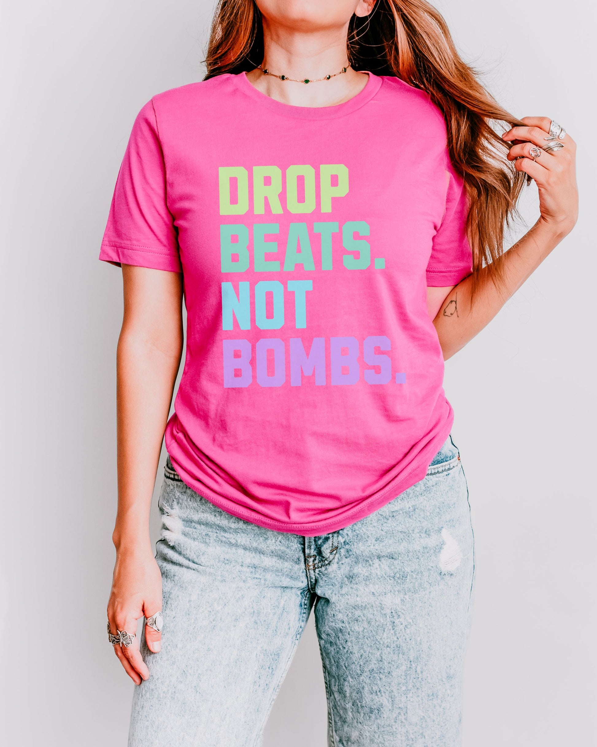 Drop Beats Not Bombs T-Shirt – Bella + Canvas Colorful Peace Music Tee
