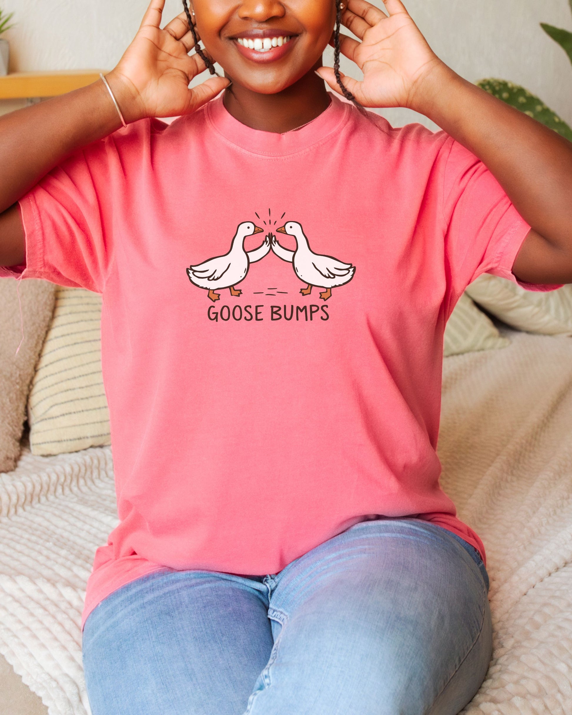 A pun you can actually wear. The “Goosebumps” t-shirt features two geese throwing a wing bump, because why should humans have all the fun? Equal parts quirky and clever, this design blends humor with soft vintage style for the perfect conversation starter.