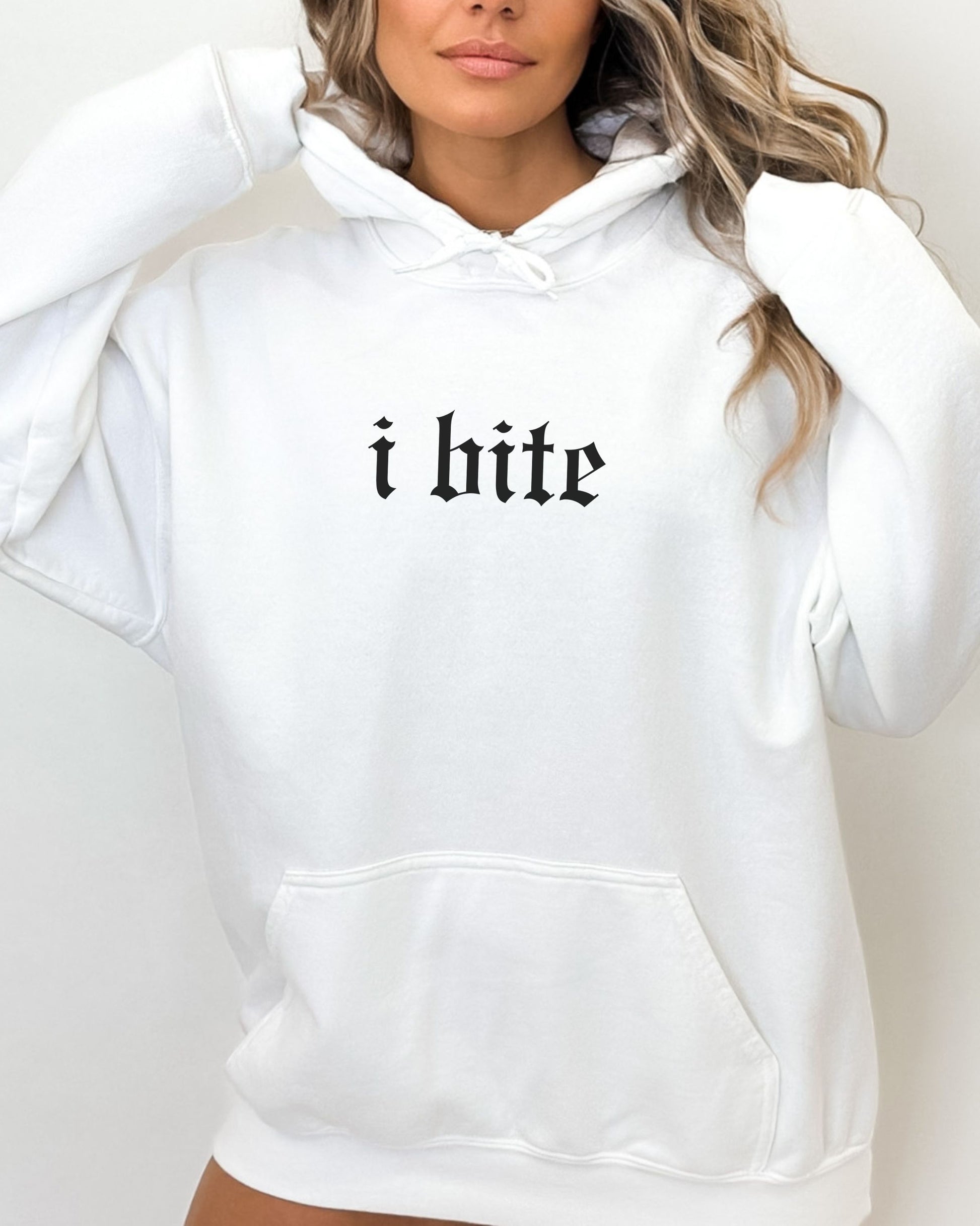 Cozy with teeth. The “i bite” hoodie features bold gothic engraver-style lettering in a minimalist design that doubles as both a statement and a warning. Darkly playful, sarcastic, and effortlessly edgy, it’s the pullover for anyone whose vibe is equal parts comfort and rebellion.