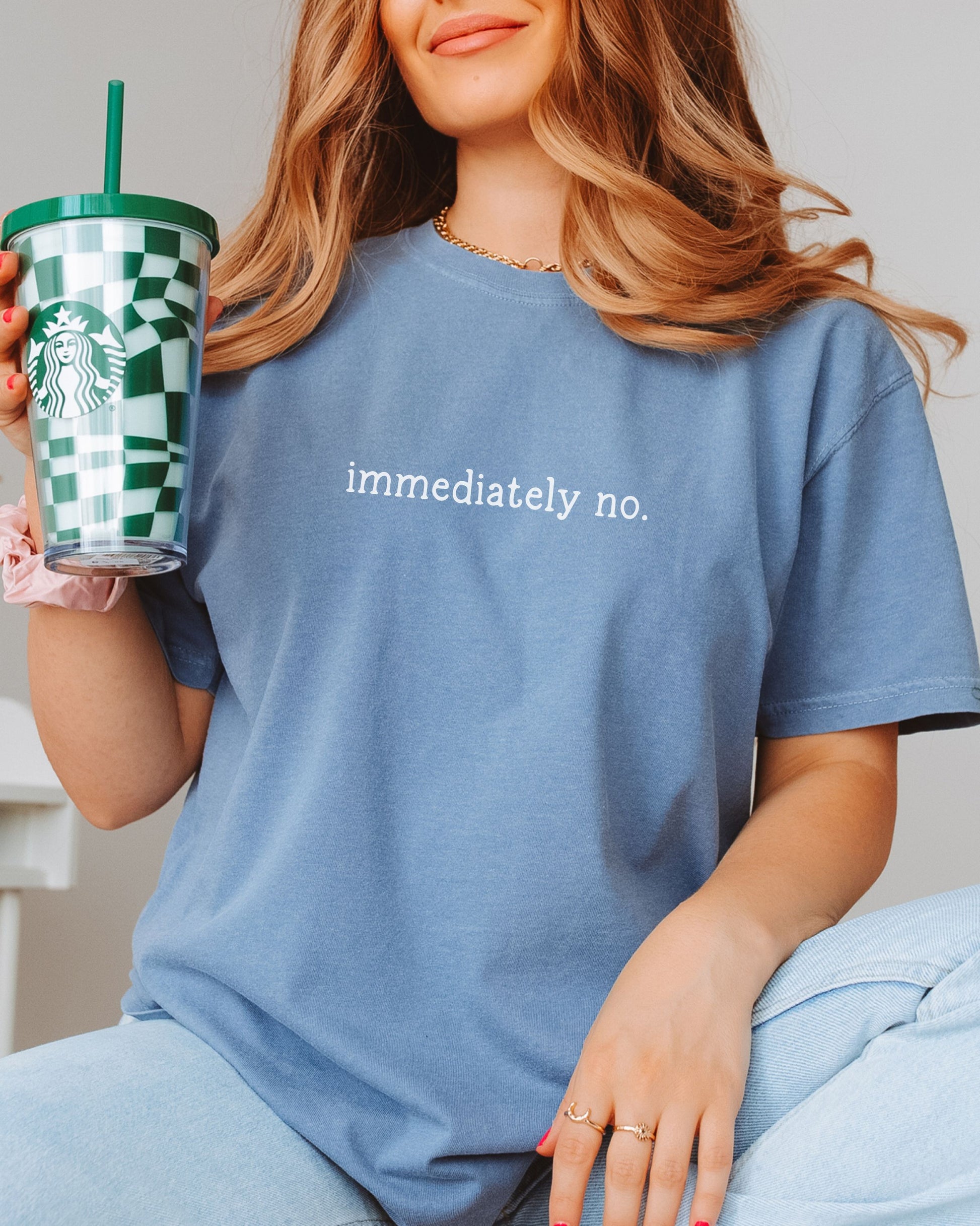 Printed on a Comfort Colors t-shirt, this design features the blunt, iconic phrase “immediately no.” — simple, bold, and unapologetically direct. It’s the perfect uniform for saying absolutely not without saying a word.