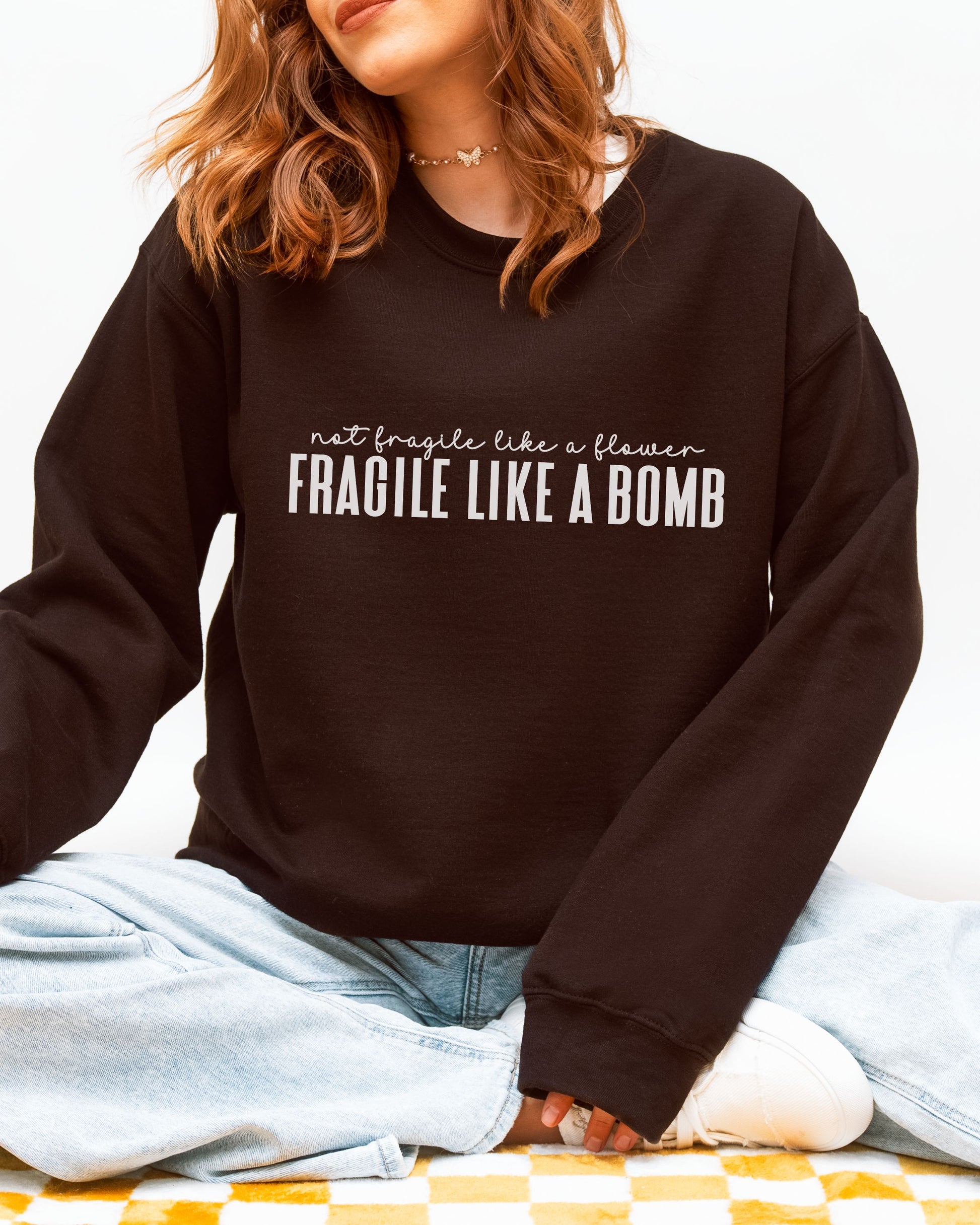 Printed on a Gildan crewneck sweatshirt, this design declares “Not Fragile Like a Flower, Fragile Like a Bomb” — a reminder that softness and strength can coexist, and feminine power isn’t to be underestimated.