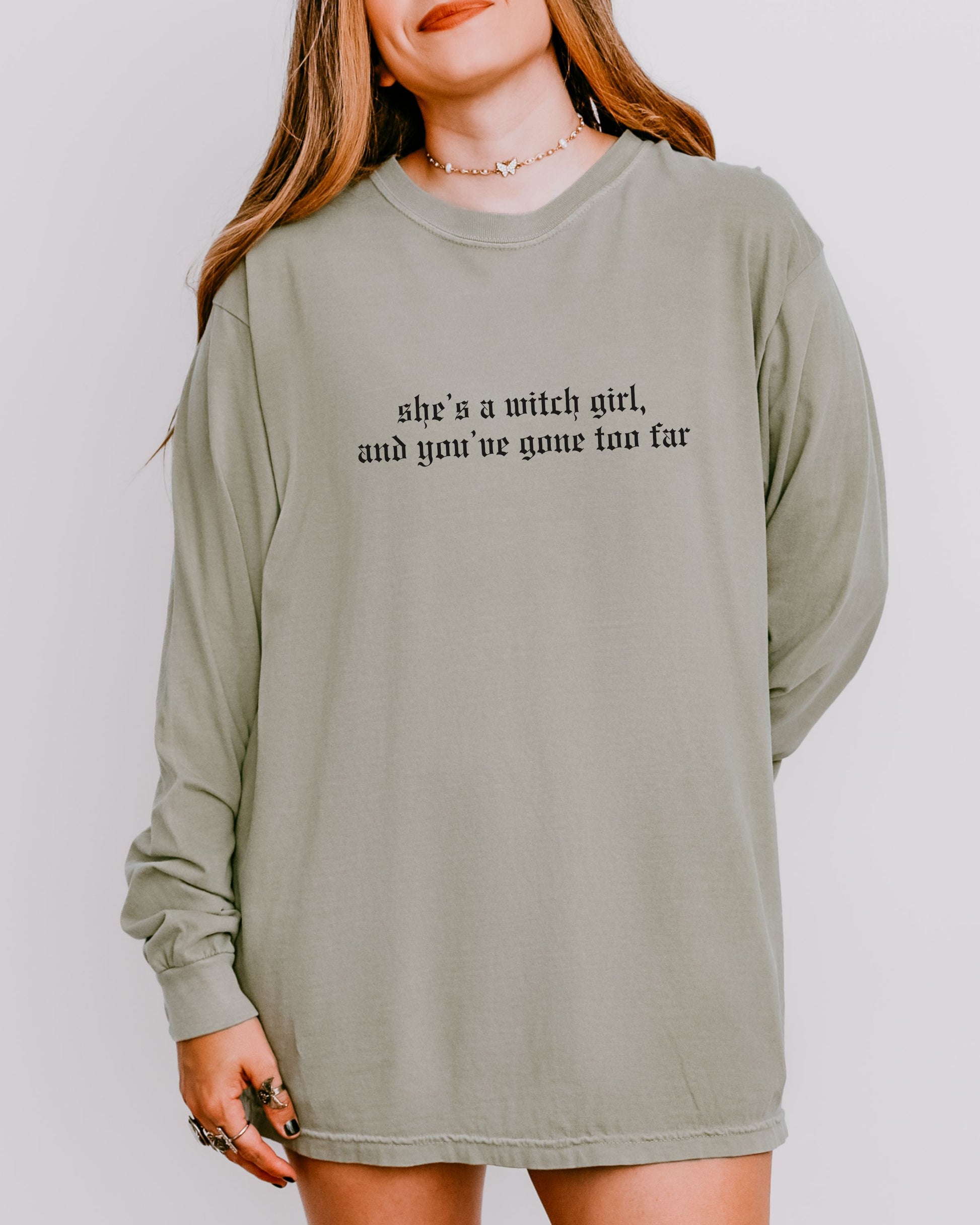Printed on a Comfort Colors long sleeve shirt, the “She’s a Witch Girl, and You’ve Gone Too Far” design blends gothic energy with unapologetic feminism. Bold black lettering channels moody defiance, while the garment-dyed cotton delivers that vintage softness Comfort Colors is known for.