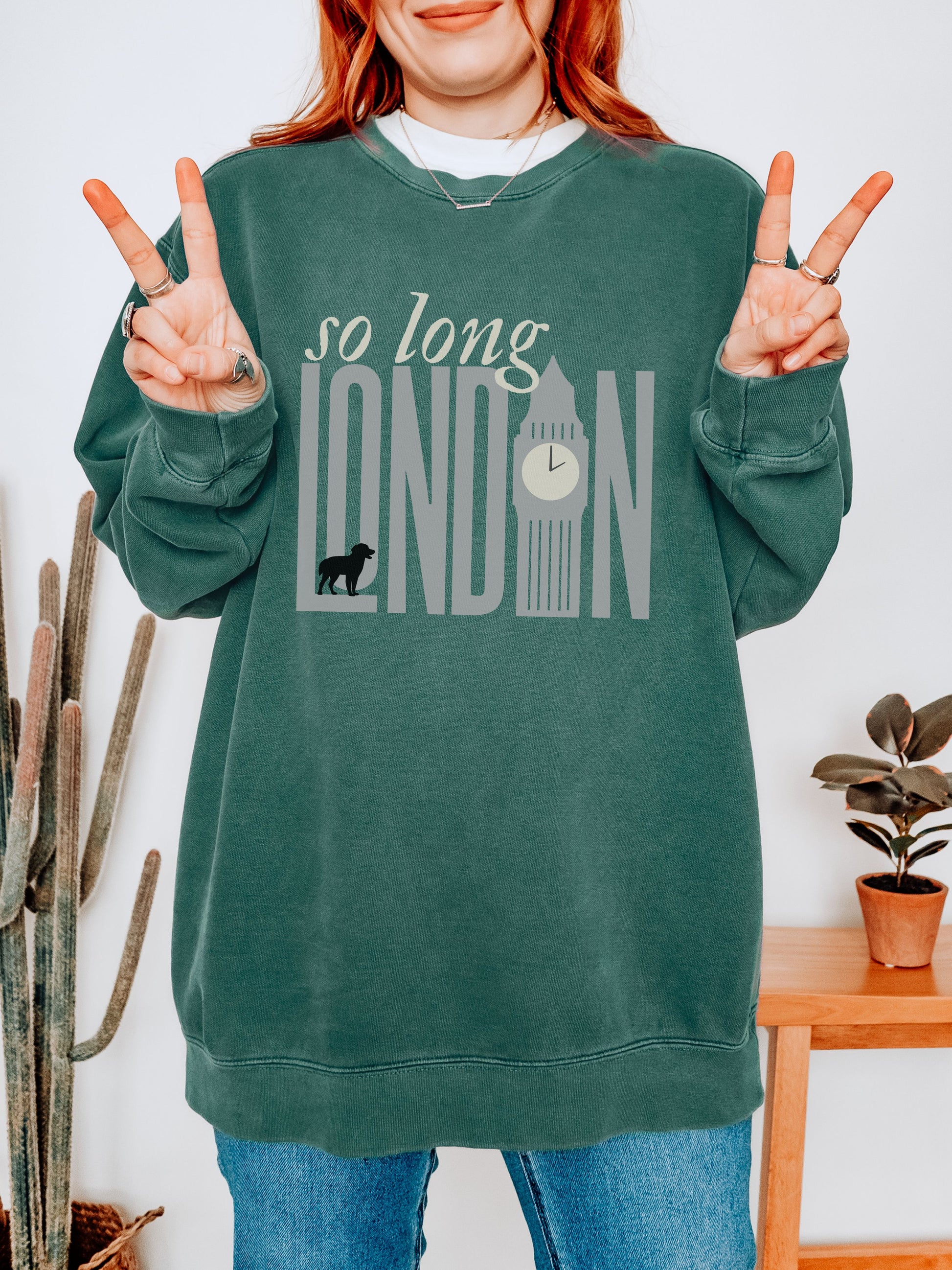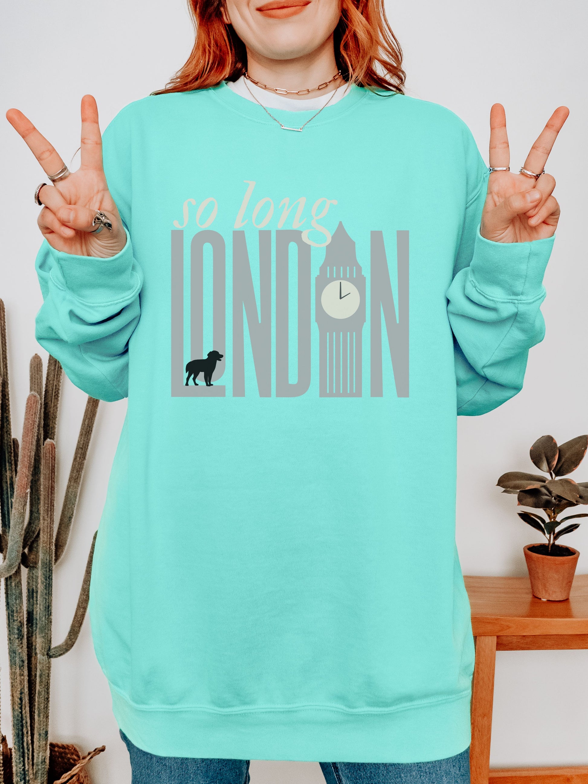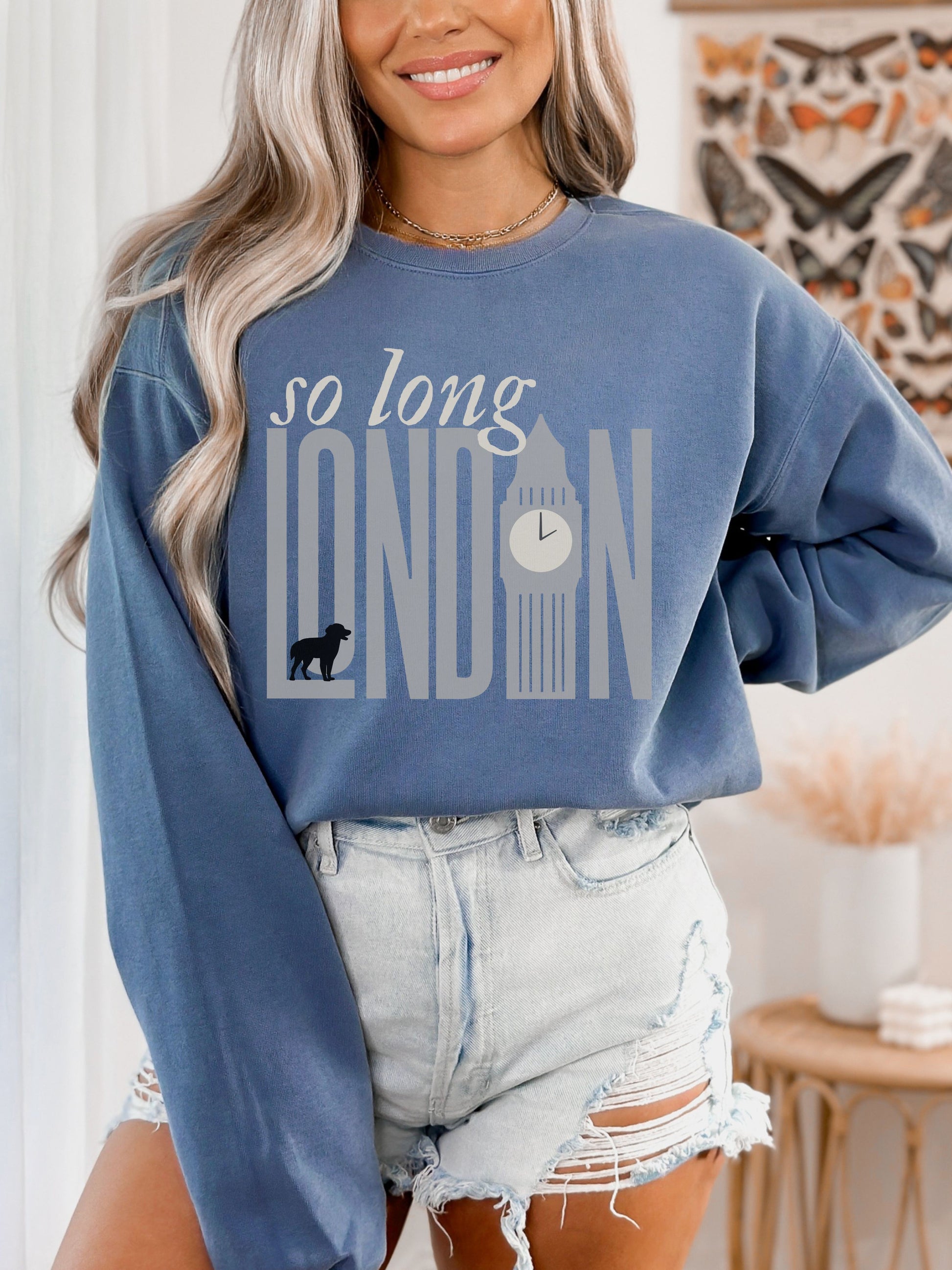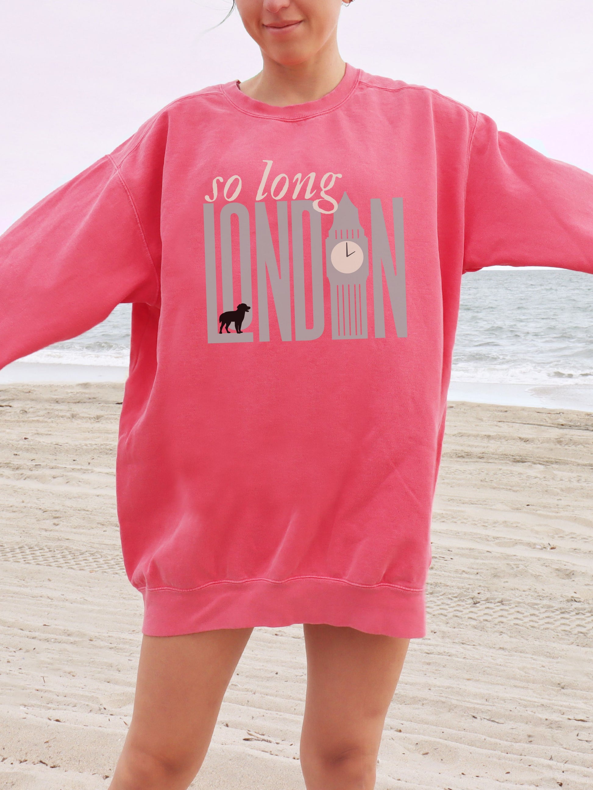 So Long London Sweatshirt – Comfort Colors Crewneck with Dog & Clock Graphic