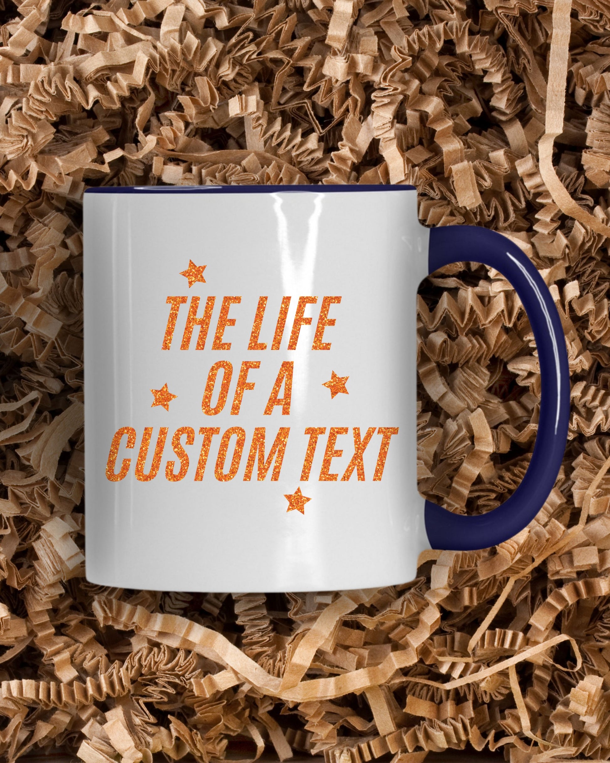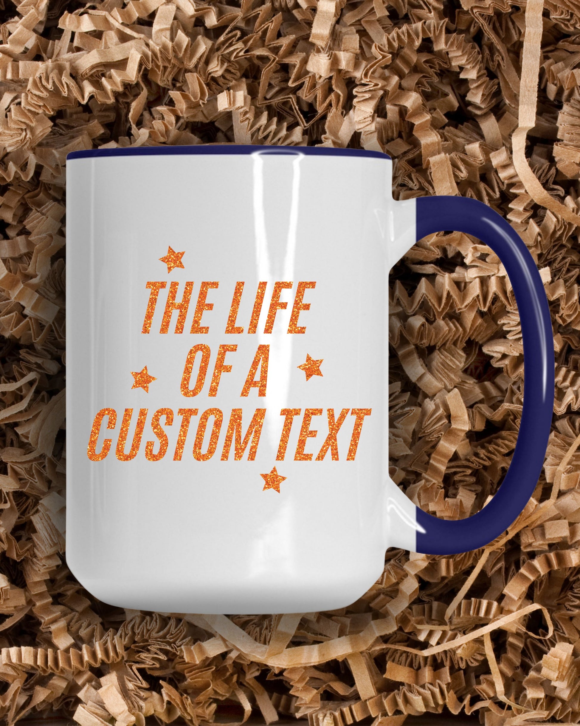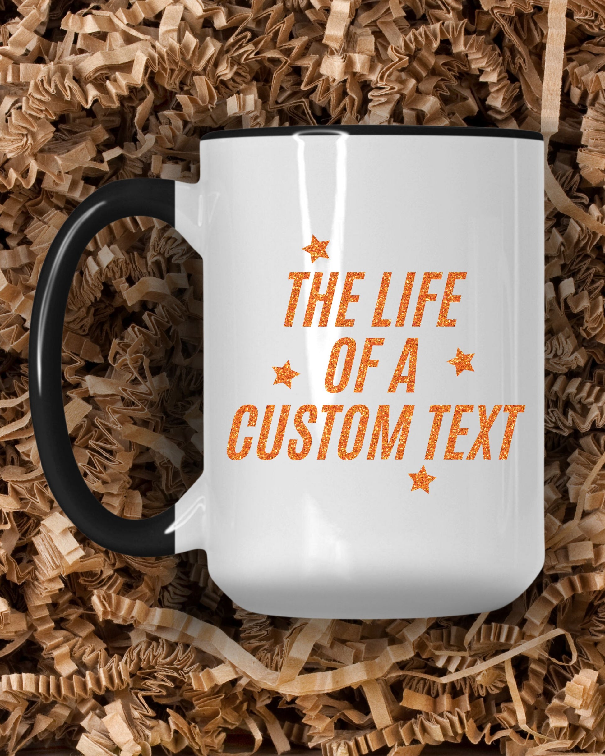 Make your morning coffee personal. The “The Life Of A…” mug lets you finish the story your way—customized with your own text, name, lyric, or phrase. Printed in a glitter-effect orange design, it gives you all the sparkle with none of the mess (smooth to the touch, no real glitter).